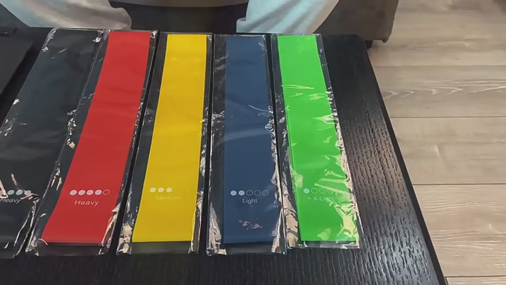 The elastic bands have 5 resistance levels, each color has different resistance and width for different uses. You can increase the challenge by adding or reducing the slack in the bands and by combining multiple exercise bands.